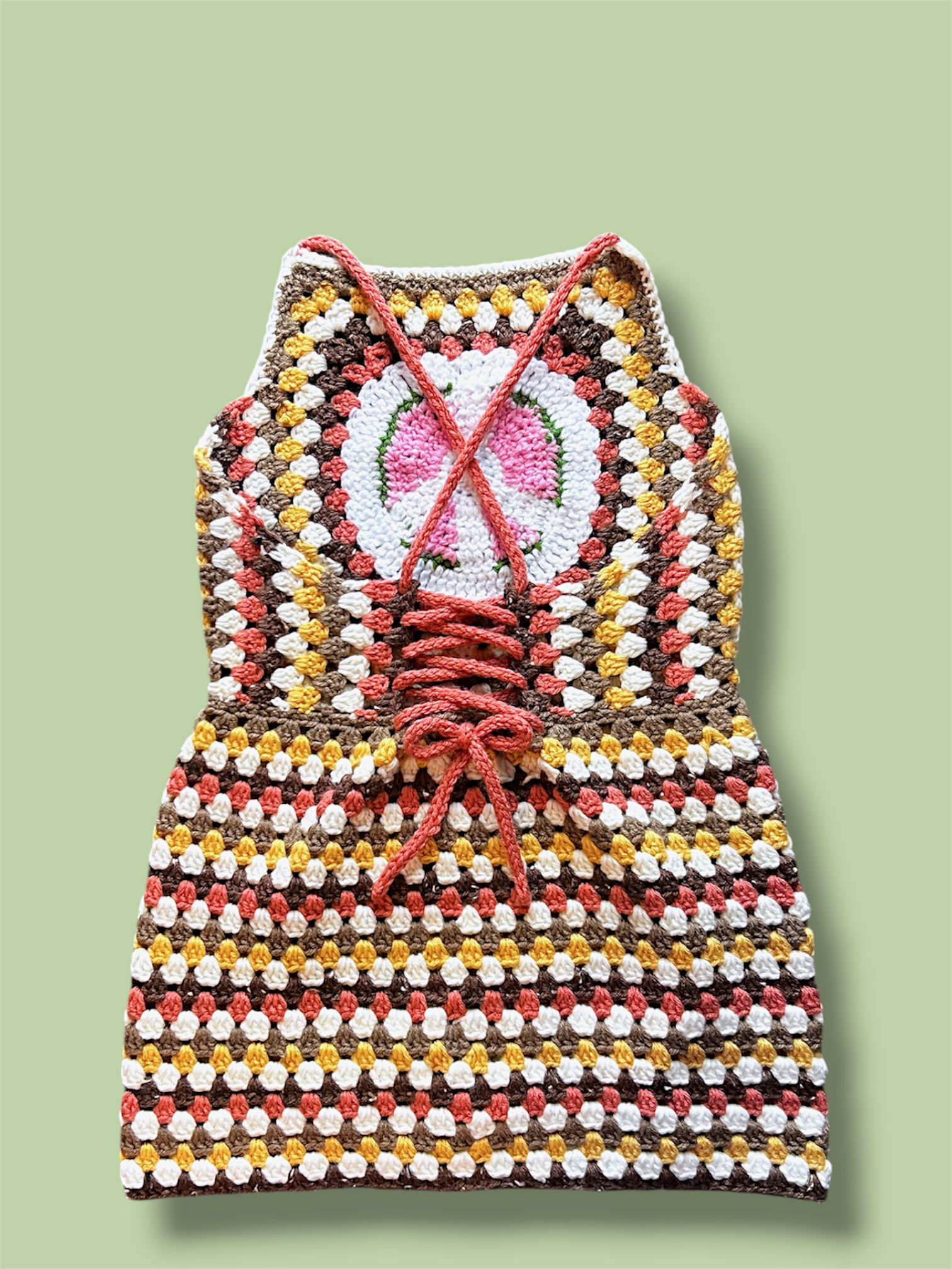 Peace Over All Dress made with a 70s inspired color palette 🧶 & beret hat to match!